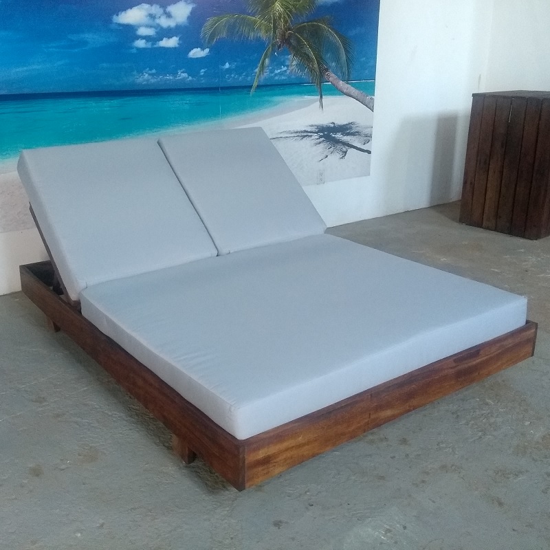 Descripción: Camastro doble de madera natural para exterior modelo Gerona con sistema de inclinación en el respaldo de 4 posiciones. Los cojines son de poliuretano de alta densidad con forro de tela acrílica para exteriores. (tono a escoger, se venden por separado).