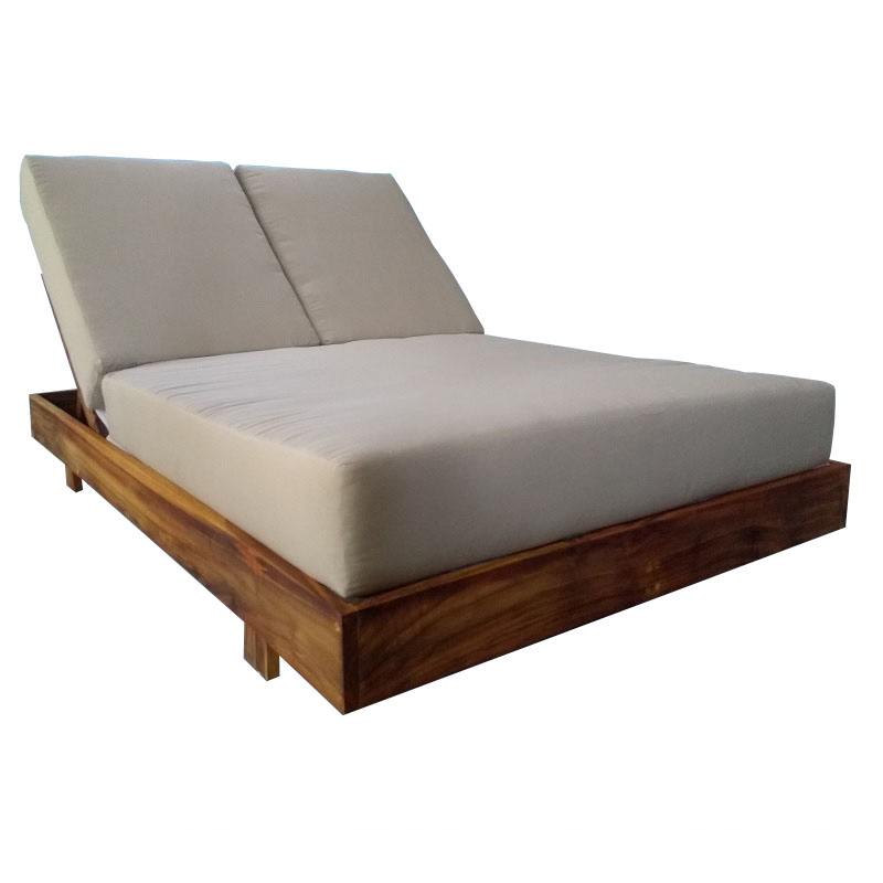 Descripción: Camastro doble de madera natural para exterior modelo Gerona con sistema de inclinación en el respaldo de 4 posiciones. Los cojines son de poliuretano de alta densidad con forro de tela acrílica para exteriores. (tono a escoger, se venden por separado).